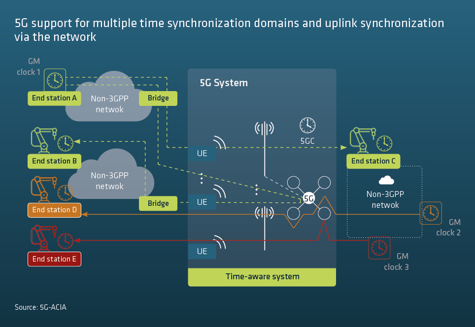 5G acts as a IEEE 802.1AS compatible time-aware system to support TSN time synchronization. A 5GS can support synchronization for up to 128 separate gPTP time domains simultaneously.