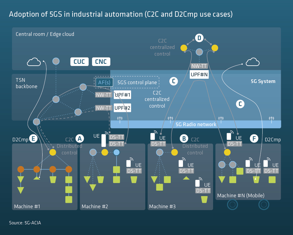The figure shows an example of how 5G system is integrated with TSN in a factory, where 5G provides communication services for various industrial use cases (e.g. controller-to-controller).